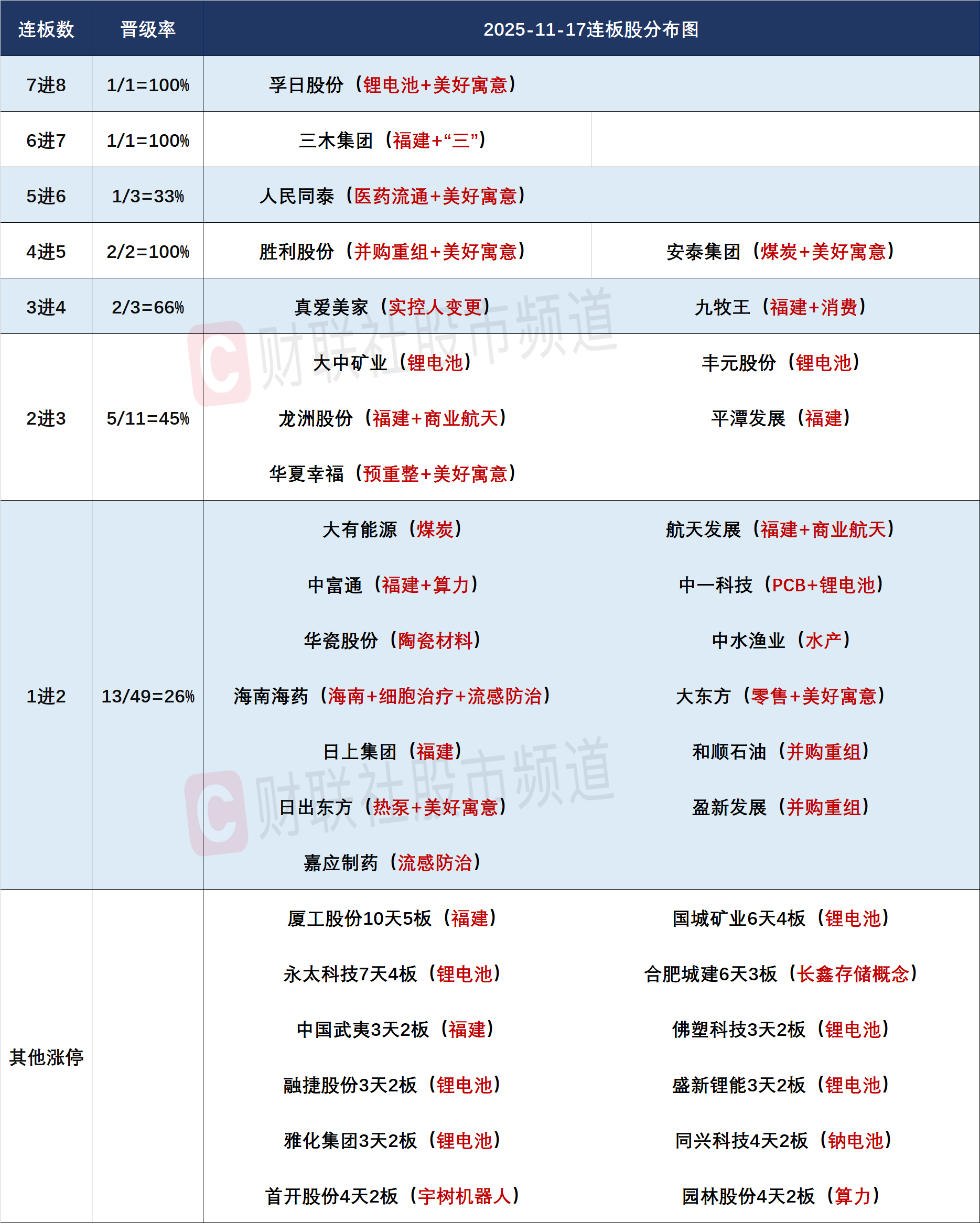 连板晋级率57.14%,最高标孚日股份一字涨停晋级8连板,高位投机方向持续得到资金深度抱团,“炒地图”、“炒玄学”风格继续主导,人气龙头平潭发展缩量一字板实现晋级,再度引爆福建本地股爆发,板块内20余只成分股涨停,此外煤炭板块人气股安泰集团盘中上演“准天地天”涨停。此外“美好寓意”概念人民同泰录得6连板,真爱美家走出4连板,但人气龙头合富中国临时停牌,或仍将对短线投机方向高位股形成情绪面制约。