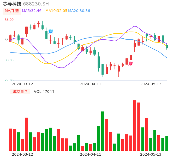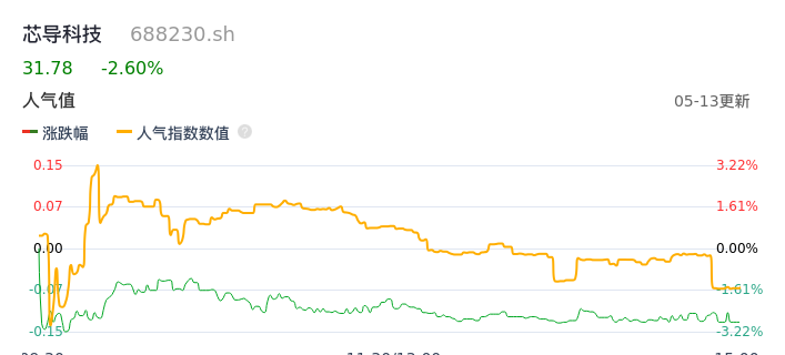 05月13日,芯导科技收报31.78,股价涨幅-2.60%,成交金额1498.93万元,换手率1.60%。