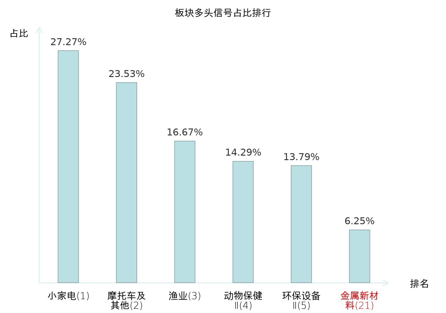 全市场所有行业板块中主力多头信号占比排名中,小家电板块位居第一。渔业板块名次提升最快,较昨日上升122位。