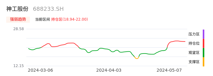 我们来看一下该股的九方特色指标强弱趋势的情况:神工股份自04月26日从观望区上穿到持仓区。股价近期在多头区域持续强势上扬,上升动能仍较为充足,可积极关注。后续重点关注上方压力位:22.00元是否能突破上攻。