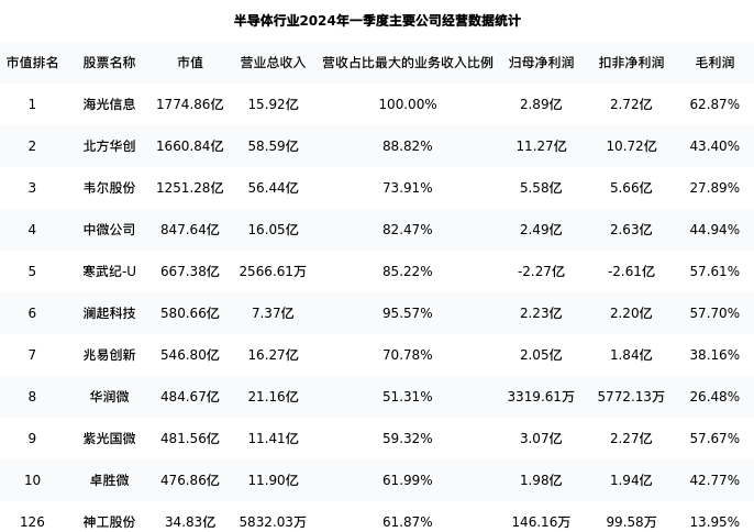 神工股份最新报告期数据为一季度,下表汇总了半导体行业内市值靠前的公司一季度主要经营数据