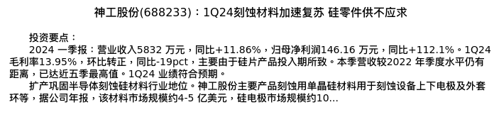 值得注意的是:2024年04月上海申银万国证券研究所的杨海晏/李天奇/袁航/杨紫璇分析师,首次发布关于神工股份的研究报告,标题为:神工股份(688233):1Q24刻蚀材料加速复苏 硅零件供不应求。
