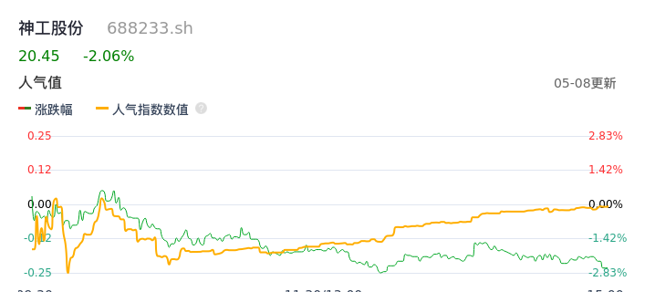 05月08日,神工股份收报20.45,股价涨幅-2.06%,成交金额5339.61万元,换手率1.52%。