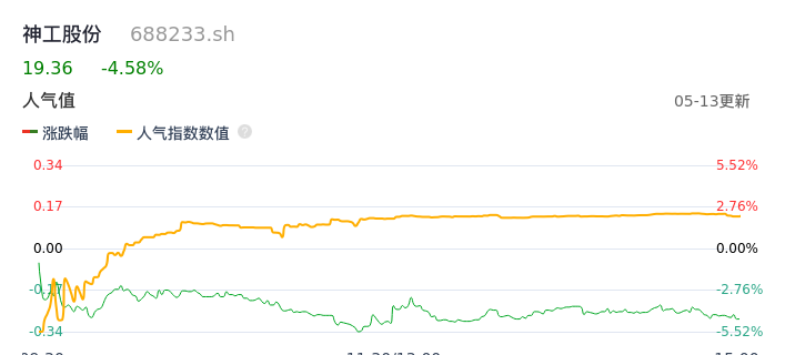 05月13日,神工股份收报19.36,股价涨幅-4.58%,成交金额7688.08万元,换手率2.31%。