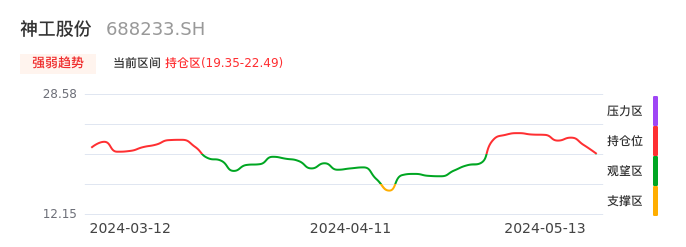我们来看一下该股的九方特色指标强弱趋势的情况:神工股份自04月26日从观望区上穿到持仓区。股价近期在多头区域回调整理。后续重点关注多空分界点的争夺:19.35元。如未能有效站稳则可能重新回到空头行情。