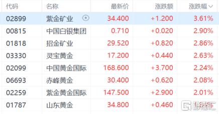 黄金股震荡走高,紫金矿业涨超3%,中国白银集团招金矿业灵宝黄金中国黄金国际涨超2%。