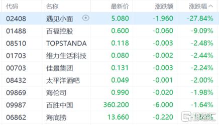 餐饮股走低,遇见小面跌超27%,百福控股跌超9%,海伦司百胜中国海底捞等跟跌。