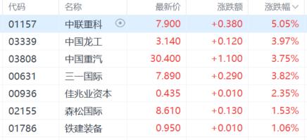 重型机械股继续涨势,中联重科续涨超5%,录得6连升,中国龙工中国重汽三一国际涨超3%。