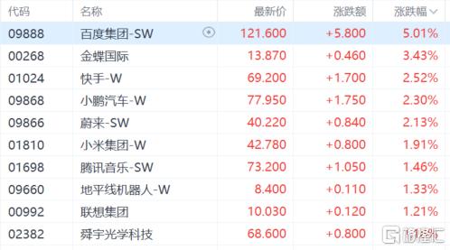 大型科技股多数上涨,百度集团涨超5%,金蝶国际涨超3%,快手、小鹏汽车蔚来涨超2%,小米集团、腾讯音乐等跟涨。