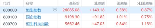 港股三大指数午后持续拉升转涨,全天呈现低开高走的单边行情,市场情绪持续回升。截止收盘,恒生指数涨0.58%再度站上26000点,国企指数恒生科技指数分别上涨1.01%及0.84%。本周,恒指累涨0.87%,国指累涨0.75%,恒生科技指数累涨1.13%。