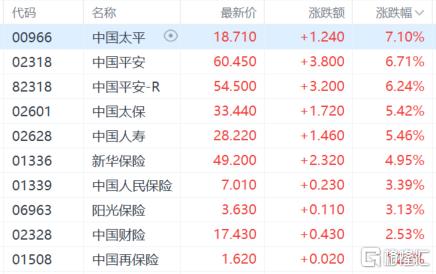 保险股表现活跃,中国太平涨超7%领涨板块,中国平安涨超6%,中国太保中国人寿涨超5%。