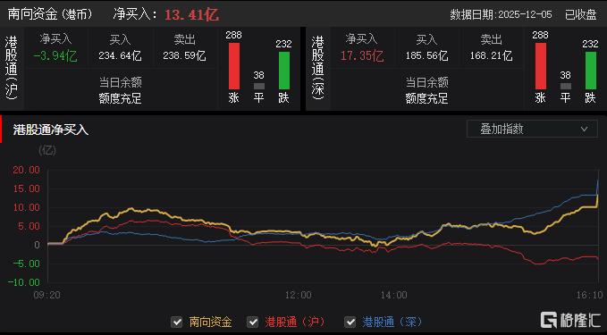 今日,南向资金净买入13.41亿港元,其中港股通(沪)净卖出3.94亿港元,港股通(深)净买入17.35亿港元。
