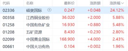 铜业股走高,江西铜业股份中国有色矿业涨超5%,五矿资源中国黄金国际涨超2%。
