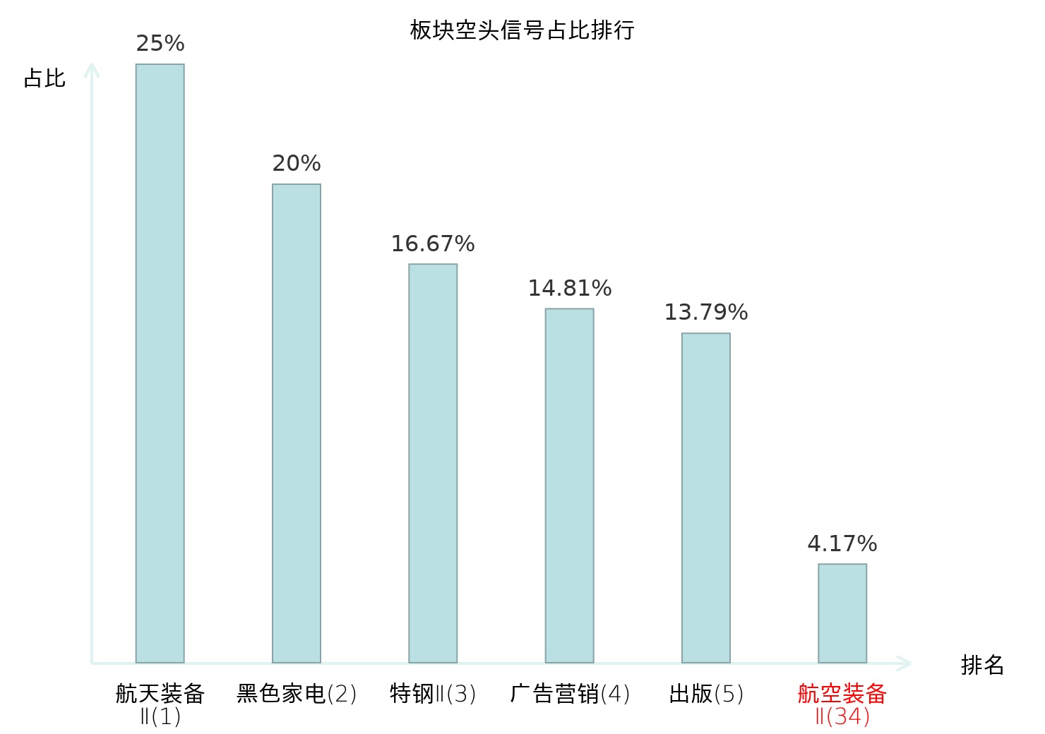 全市场所有行业板块中主力空头信号占比排名中,航天装备Ⅱ板块位居第一。软件开发板块名次提升最快,较昨日上升119位。