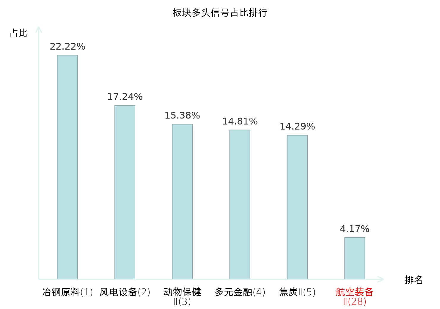 全市场所有行业板块中主力多头信号占比排名中,冶钢原料板块位居第一。冶钢原料板块名次提升最快,较昨日上升118位。