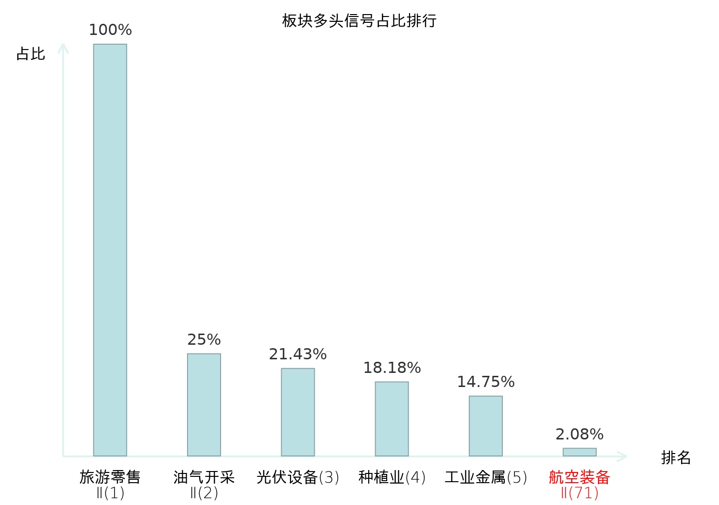 全市场所有行业板块中主力多头信号占比排名中,旅游零售Ⅱ板块位居第一。旅游零售Ⅱ板块名次提升最快,较昨日上升130位。