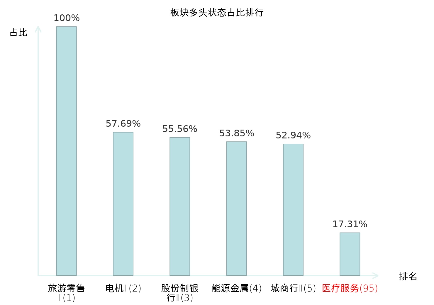 全市场所有行业板块中主力多头状态占比排名中,旅游零售Ⅱ板块位居第一。地面兵装Ⅱ板块名次提升最快,较昨日上升99位。
