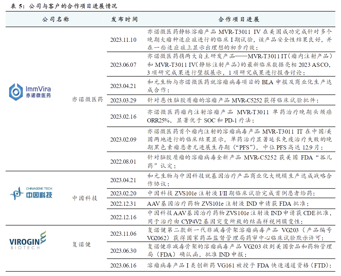 公司核心客户亦诺微医药、中因科技、复诺健的核心研发管线持续推进,临床试验结果良好。公司逐渐具备国际化条件,正通过设立美国子公司与参加国际展会等形式,积极拓展国际业务。