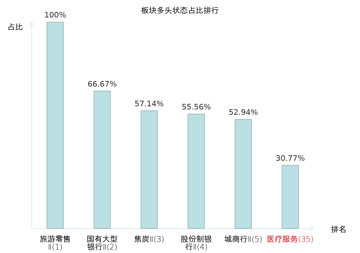 全市场所有行业板块中主力多头状态占比排名中,旅游零售Ⅱ板块位居第一。其他家电Ⅱ板块名次提升最快,较昨日上升101位。