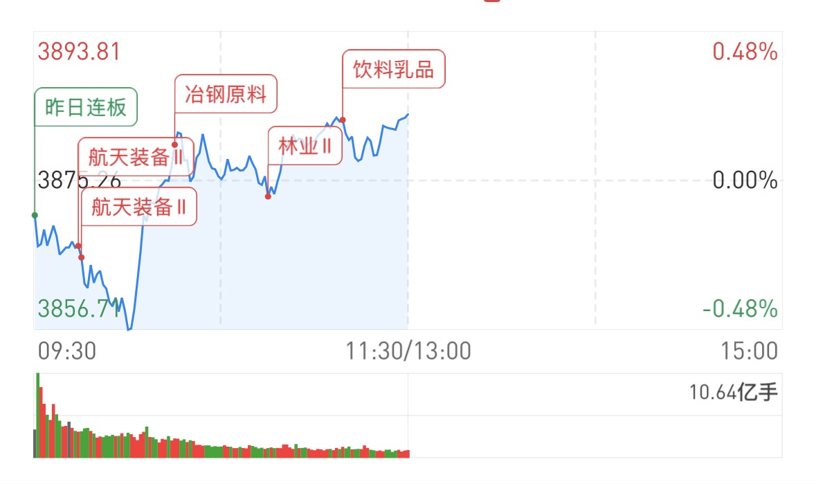 市场早盘探底回升,三大指数集体翻红。沪深两市半日成交额不足1万亿,较上个交易日缩量1123亿。盘面上热点快速轮动,全市场超3500只个股上涨。从板块来看,海南板块持续走高,海南瑞泽4天3板。商业航天概念股爆发,雷科防务反包5天4板,乾照光电20cm涨停。福建板块再度大涨,福建水泥、海通发展等多股涨停。大消费板块反复活跃,海欣食品走出地天板。下跌方面,抗流感概念股集体下跌,粤万年青跌超12%。