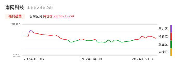我们来看一下该股的九方特色指标强弱趋势的情况:南网科技自04月25日从观望区上穿到持仓区。股价近期在多头区域回调整理。后续重点关注多空分界点的争夺:28.66元。如未能有效站稳则可能重新回到空头行情。