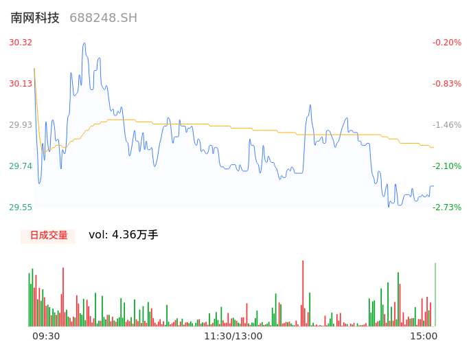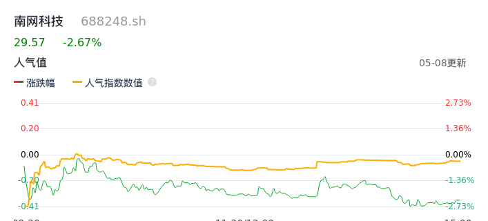 05月08日,南网科技收报29.57,股价涨幅-2.67%,成交金额1.30亿元,换手率1.91%。