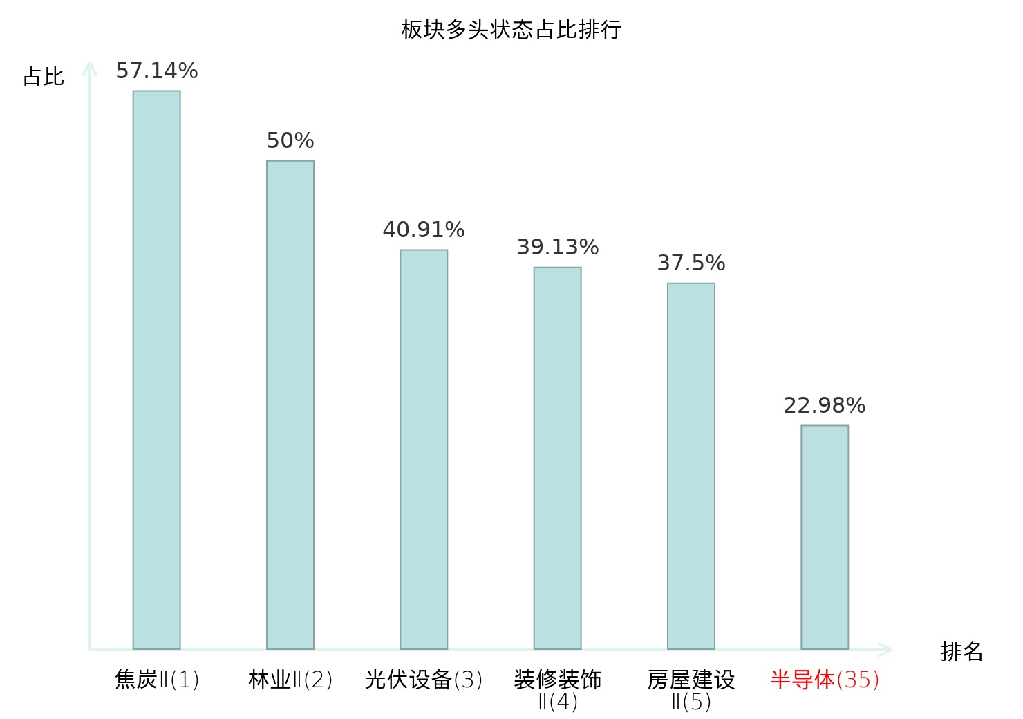 全市场所有行业板块中主力多头状态占比排名中,焦炭Ⅱ板块位居第一。油服工程板块名次提升最快,较昨日上升51位。