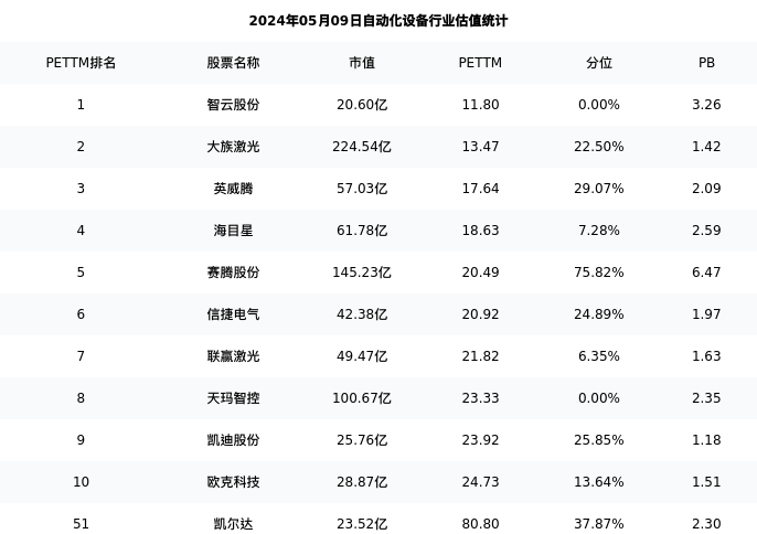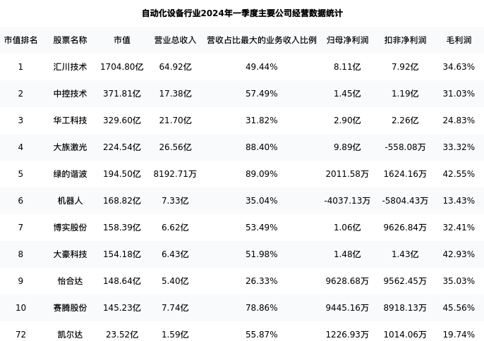 凯尔达最新报告期数据为一季度,下表汇总了自动化设备行业内市值靠前的公司一季度主要经营数据