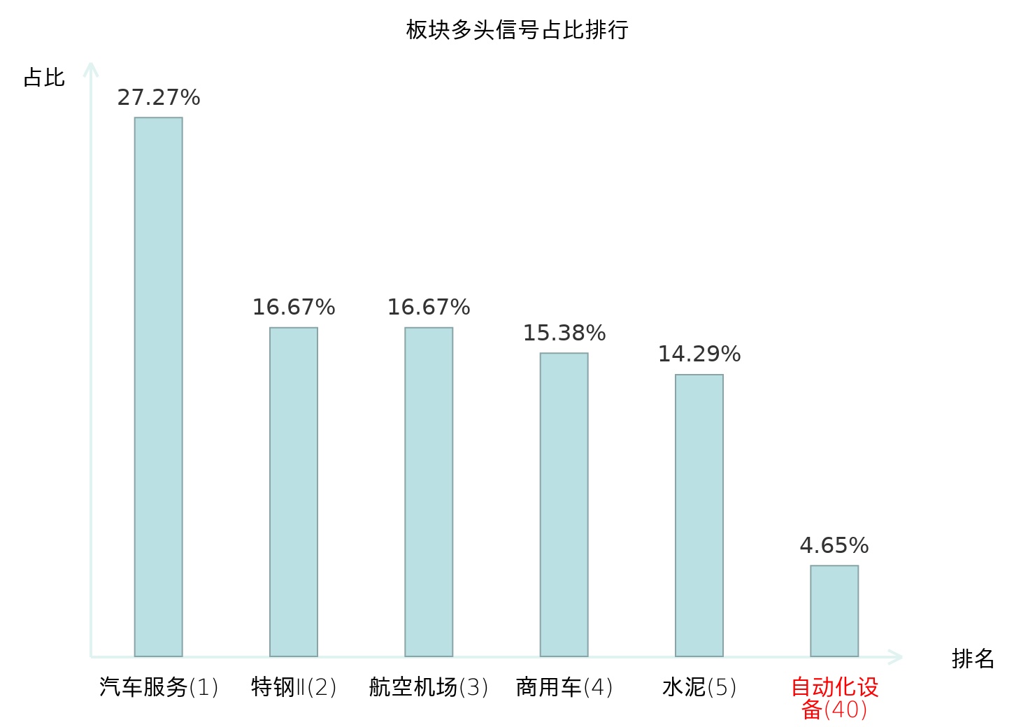 全市场所有行业板块中主力多头信号占比排名中,汽车服务板块位居第一。汽车服务板块名次提升最快,较昨日上升112位。