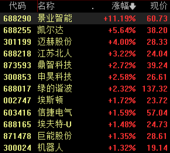 8月11日盘中,机器人概念股持续拉升,截至发稿,景业智能涨超11%,凯尔达、迈赫股份涨超5%,江苏北人、鼎智科技、绿的谐波等跟涨。