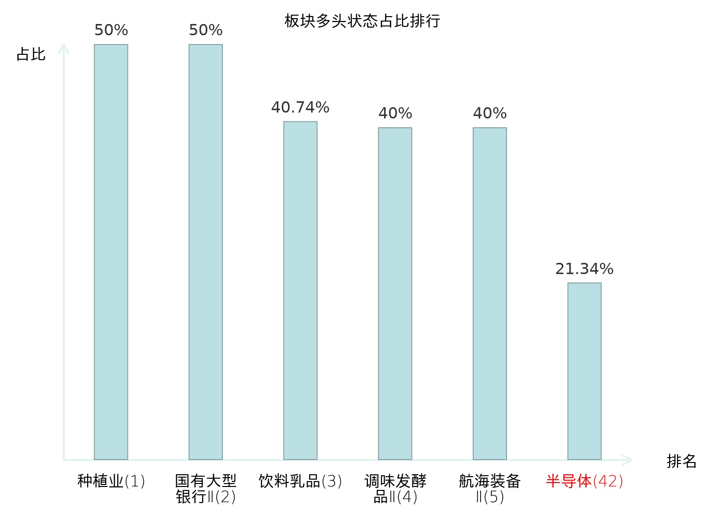 全市场所有行业板块中主力多头状态占比排名中,种植业板块位居第一。冶钢原料板块名次提升最快,较昨日上升89位。