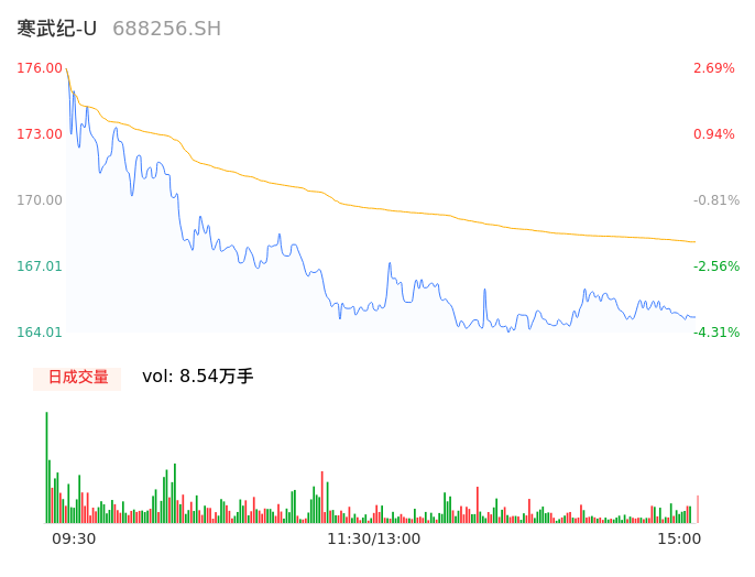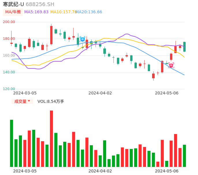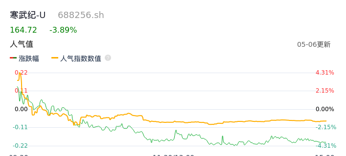05月06日,寒武纪-U收报164.72,股价涨幅-3.89%,成交金额14.35亿元,换手率2.05%。
