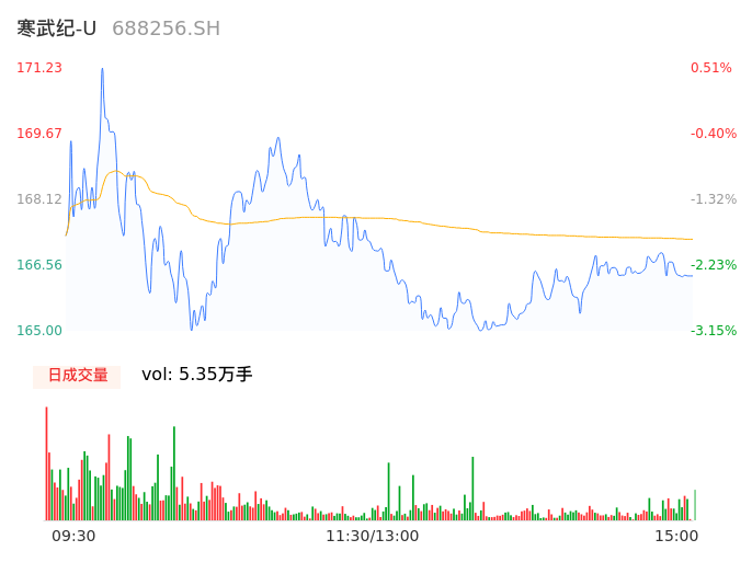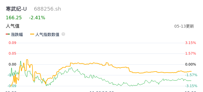 05月13日,寒武纪-U收报166.25,股价涨幅-2.41%,成交金额8.95亿元,换手率1.29%。