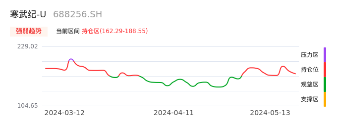 我们来看一下该股的九方特色指标强弱趋势的情况:寒武纪-U自04月26日从观望区上穿到持仓区。股价近期在多头区域回调整理。后续重点关注多空分界点的争夺:162.29元。如未能有效站稳则可能重新回到空头行情。