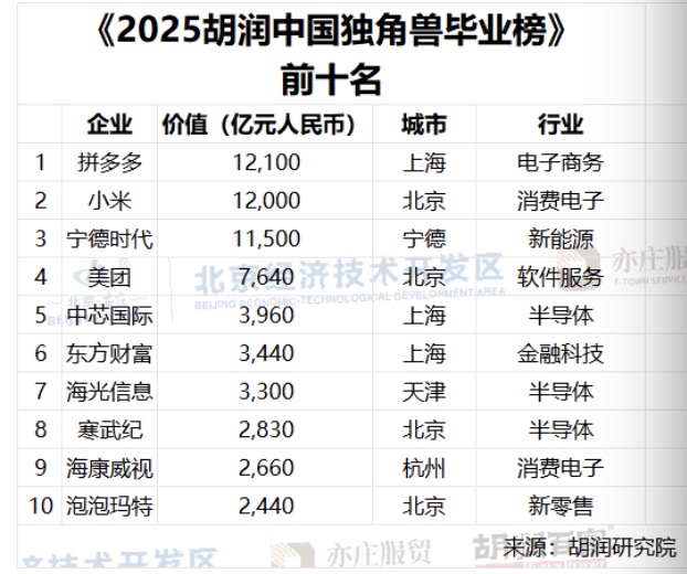 上证报中国证券网讯胡润研究院1月15日发布《2025胡润中国独角兽毕业榜》,列出了中国成立于2000年之后、价值10亿美元以上的上市公司。榜单按企业价值进行排名,估值计算的截止日期为2025年5月15日。其中显示,拼多多、小米和宁德时代三家企业成为独角兽“毕业生”的典范。