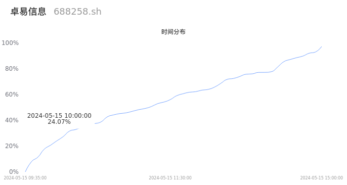 688258卓易信息2024年05月15日成交7508手,成交金额2579.34万元,相较昨日缩量1952手,换手率0.86%,成交清淡。