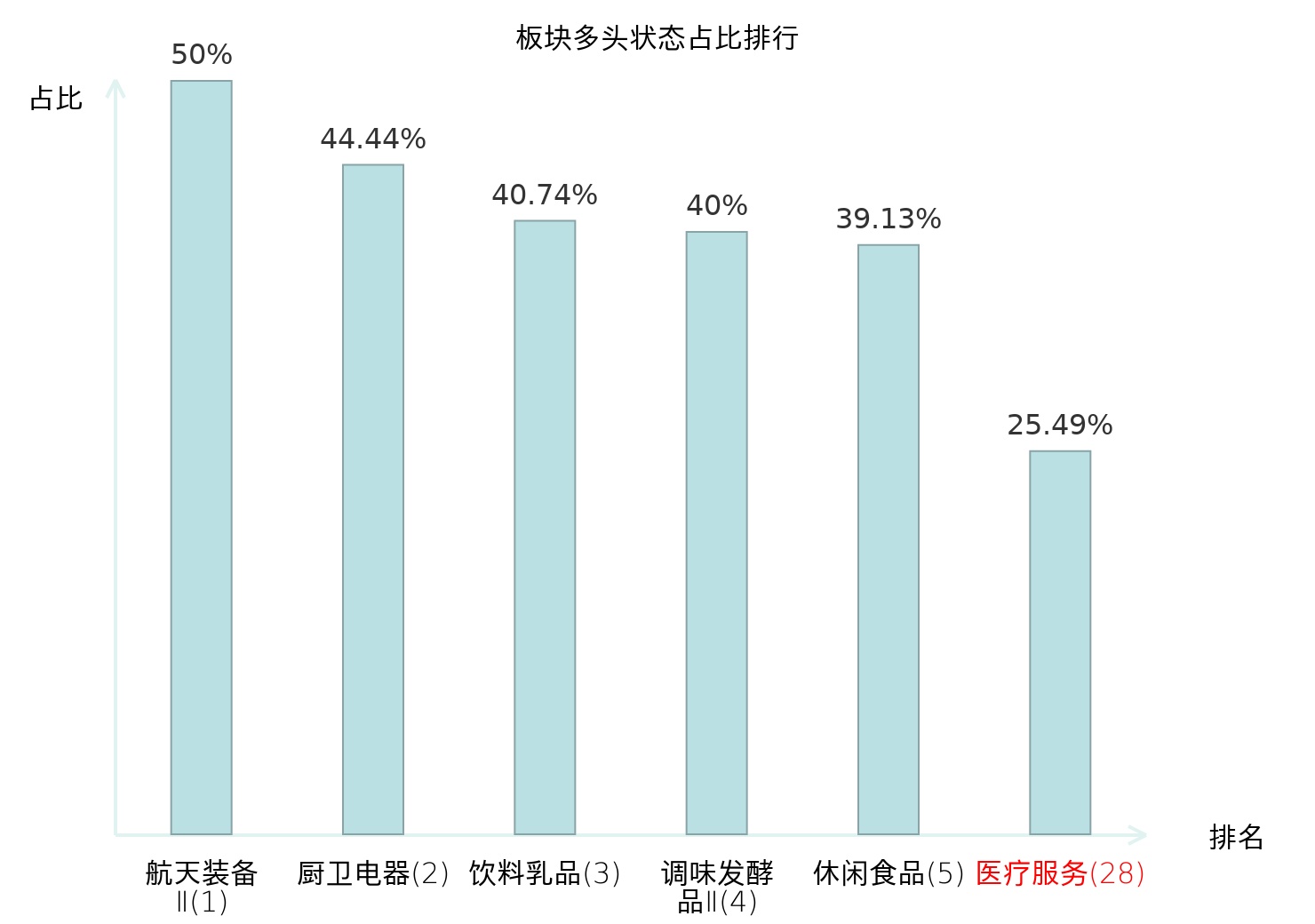 全市场所有行业板块中主力多头状态占比排名中,航天装备Ⅱ板块位居第一。林业Ⅱ板块名次提升最快,较昨日上升92位。