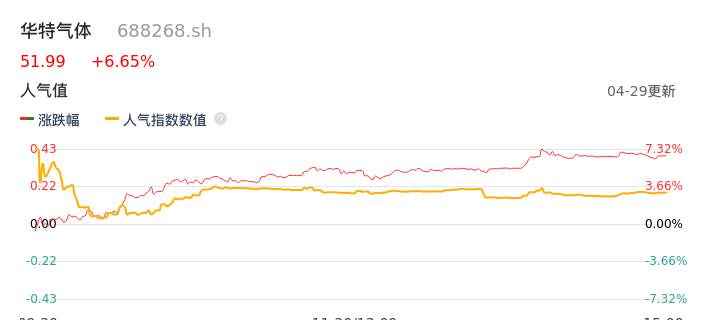 04月29日,华特气体收报51.99,股价涨幅6.65%,成交金额1.04亿元,换手率1.70%。