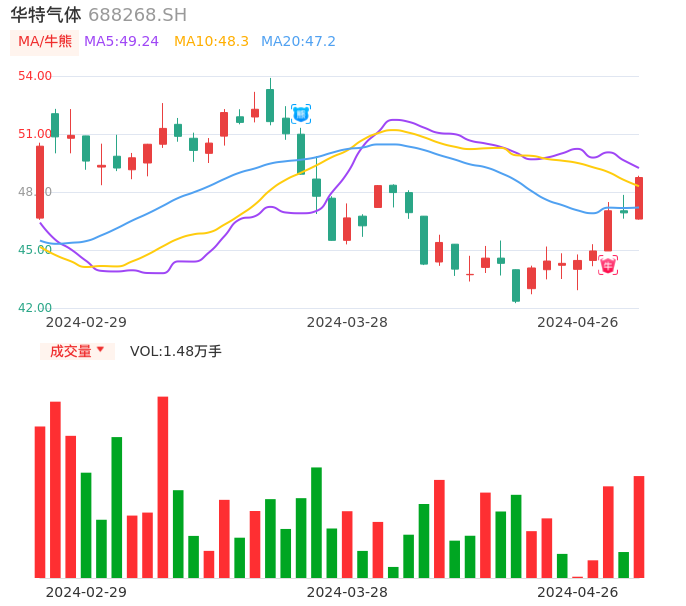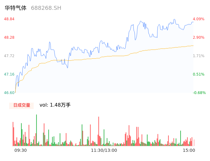 04月26日,华特气体收报48.75,股价涨幅3.90%,成交金额7118.23万元,换手率1.23%。