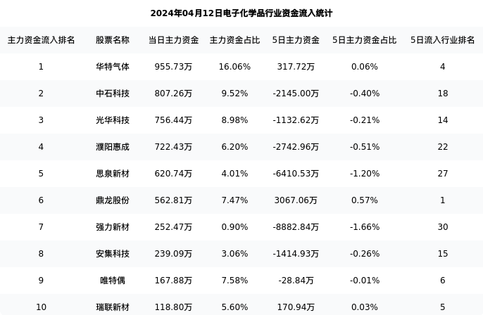 从主力资金流向来看,电子化学品行业今日主力资金流入6.18亿元,在所有申万二级行业中排名:59/131。