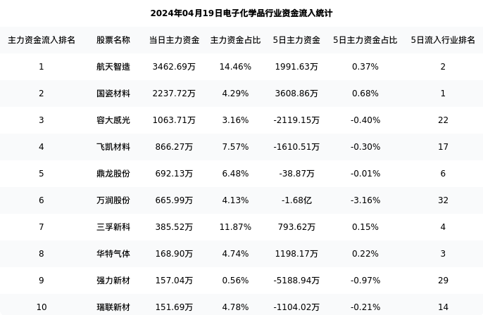 从主力资金流向来看,电子化学品行业今日主力资金流入7.44亿元,在所有申万二级行业中排名:30/131。