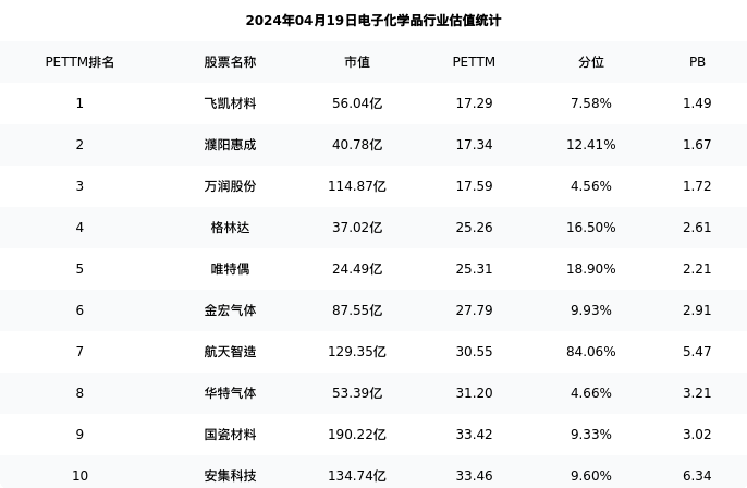 从估值角度看:华特气体最新市盈率PETTM为31.20,在行业内排名8/32,处于4.66分位。