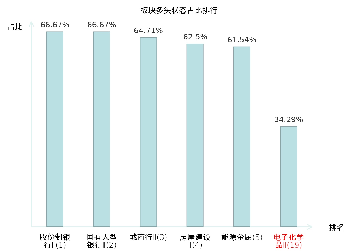 全市场所有行业板块中主力多头状态占比排名中,股份制银行Ⅱ板块位居第一。其他家电Ⅱ板块名次提升最快,较昨日上升102位。