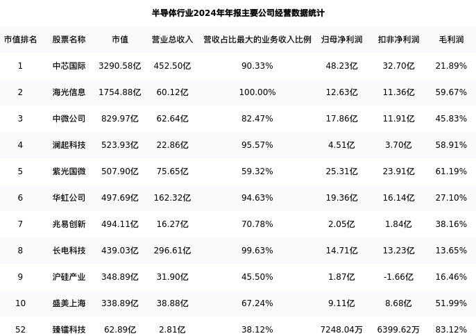 臻镭科技最新报告期数据为年报,下表汇总了半导体行业内市值靠前的公司年报主要经营数据