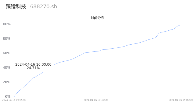 688270臻镭科技2024年04月16日成交2.78万手,成交金额1.15亿元,相较昨日缩量7428手,换手率2.70%,成交清淡。