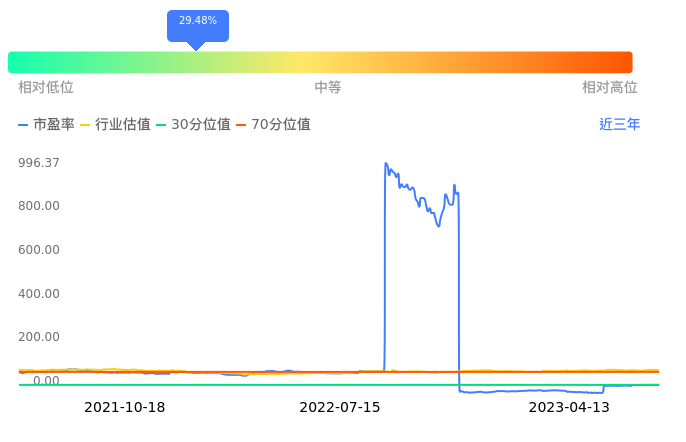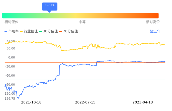 富吉瑞当前市盈率PETTM为-42.25,在所属的军工电子中,市盈率PETTM排51名。前5名分别为振华科技PETTM20.00、鸿远电子PETTM22.80、宏达电子PETTM22.92、火炬电子PETTM24.12、全信股份PETTM28.94。从PETTM估值走势数据来看,富吉瑞当前市盈率PETTM为-42.25,超过近3年29.48%的历史数据。