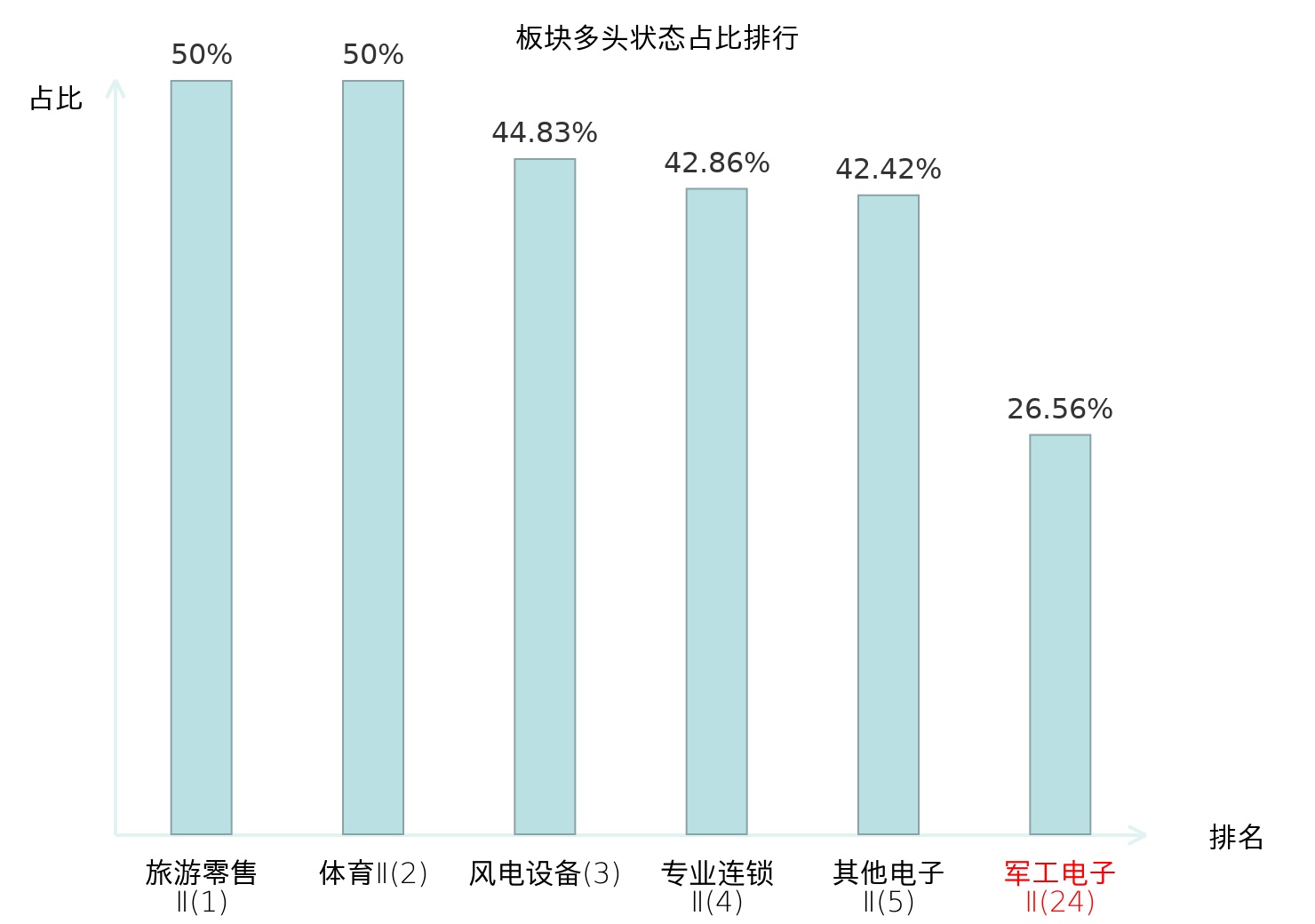 全市场所有行业板块中主力多头状态占比排名中,旅游零售Ⅱ板块位居第一。化妆品板块名次提升最快,较昨日上升66位。