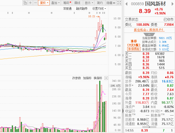 市场情绪:市场热点快速轮动,全市场近3400只个股上涨。今日全市场共64股涨停,连板股总数18只,27股封板未遂,封板率为70%(不含ST股、退市股)。焦点股方面,并购重组的国晟科技16天11板、金富科技6连板,商业航天概念股航天发展12天8板、雷科防务6天5板,福建本地股实达集团8天6板,光刻胶概念股国风新材9天5板。