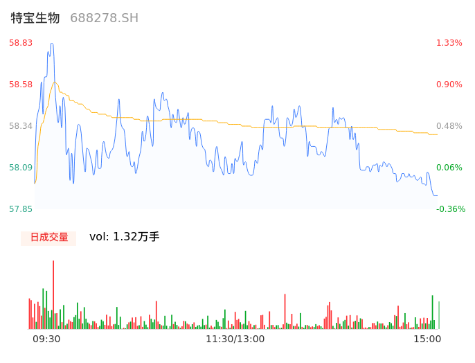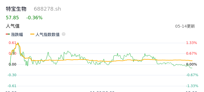 05月14日,特宝生物收报57.85,股价涨幅-0.36%,成交金额7721.06万元,换手率0.33%。