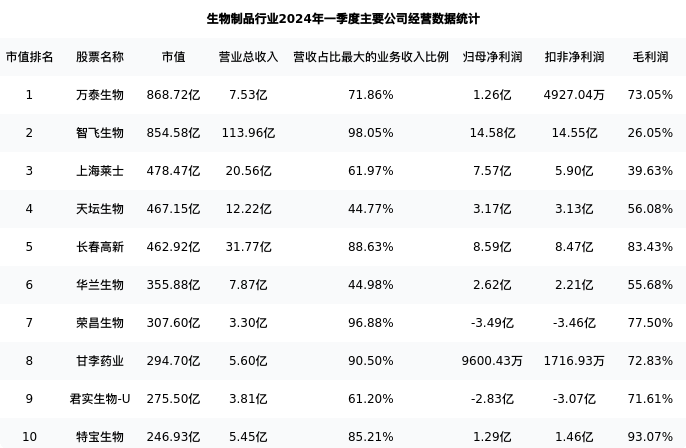 特宝生物最新报告期数据为一季度,下表汇总了生物制品行业内市值靠前的公司一季度主要经营数据